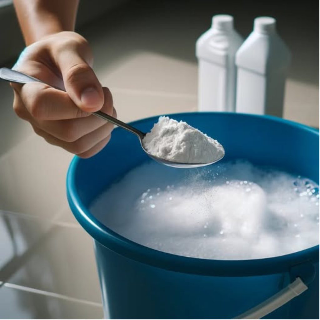 vervolg op de volgende paginaIn de bak waar we de twee liter water in hebben gegoten, voegen we een kopje witte azijn, een theelepel vloeibare zeep en tot slot een lepel natriumbicarbonaat toe.