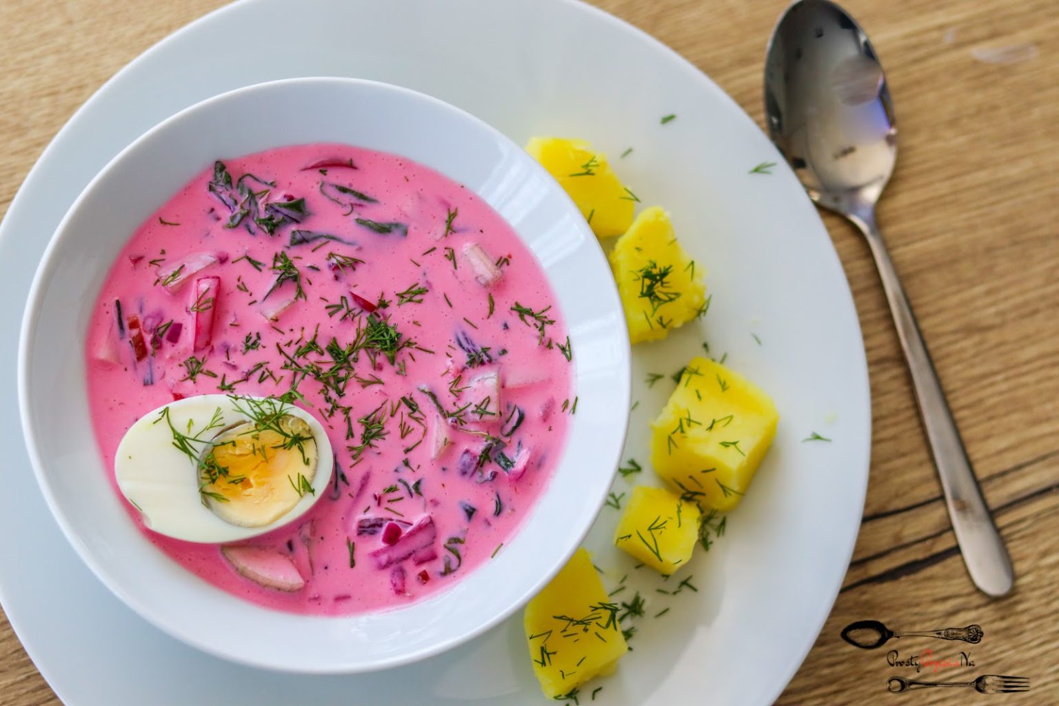 Ingrediënten: 1 liter karnemelk 1 bosje jonge bieten (met blad) 1 gekookte biet 1 bosje radijs 1 groene komkommer 1 ui 1 teentje knoflook Zout, peper, citroensap naar smaak Hardgekookte eieren voor het serveren Bereidingswijze: