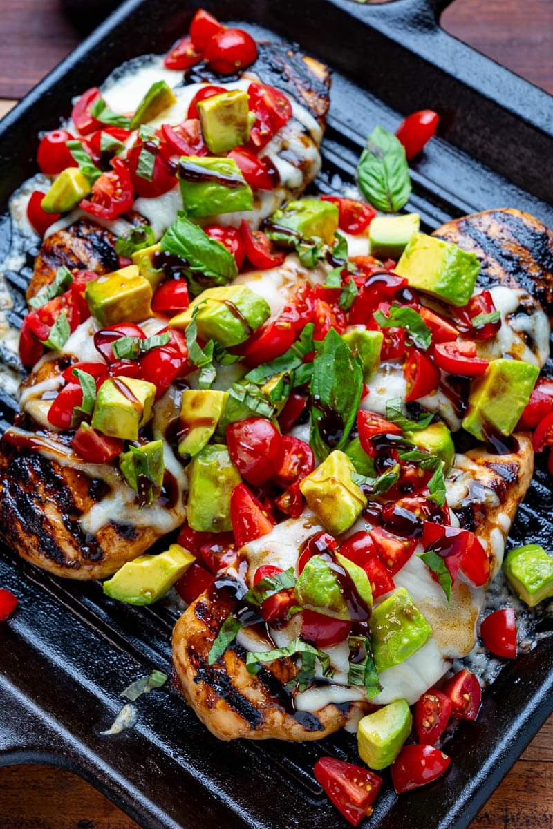 Een eenvoudige gegrilde kip gemarineerd in een balsamicovinaigrette, gegarneerd met gesmolten kaas, avocado, tomaat en basilicum!