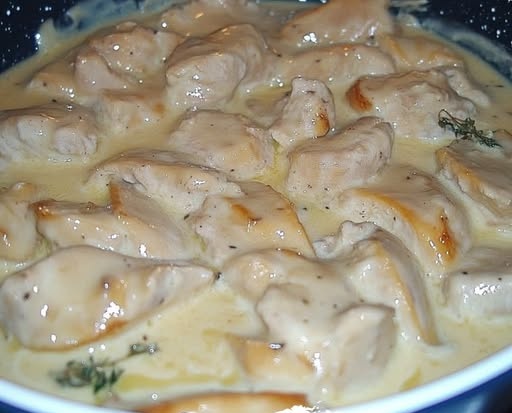 Poulet tendre cuit dans une sauce camembert riche et crémeuse avec des champignons – rapide, facile et délicieux !