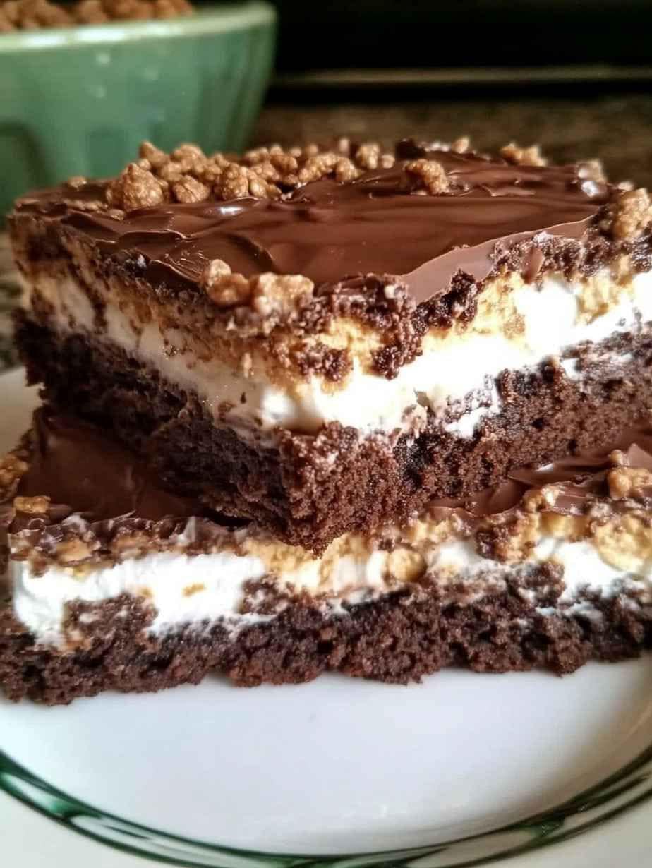 Brownie Bomb Bars zijn een decadent dessert dat rijke brownies combineert met kleverige marshmallowroom en een knapperige topping van chocolade-pindakaas. Deze heerlijke traktatie is perfect om zoete trek te stillen, te serveren op bijeenkomsten of te delen met vrienden en familie. Door klassieke smaken en texturen te combineren, zijn deze repen gemakkelijk te maken en moeilijk te weerstaan.