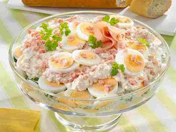Ingrediënten: 10 eieren (maat M) 500 g slacrème 40% magere yoghurt 500 g zure room Gezouten witte peper 1 Bund Petersilie 2 Kerbelbund 200 g gesneden gekookte ham Ultradun plakje ham Voorbereiding: Kook de eieren in kokend water gedurende ongeveer 10 minuten. Giet af, spoel af met koud water en schil.