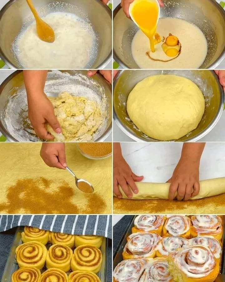 Ingrediënten: 2 eetlepels droge gist 1 kopje warme melk 1/4 kopje suiker 1 ei 55 gram koud gesmolten boter 90 gram koud gesmolten boter 3 kopjes bloem 1 snufje zout 2 eetlepels kaneel 1 kopje bruine suiker Procedure: lees meer op de volgende pagina Lees meer op de volgende pagina