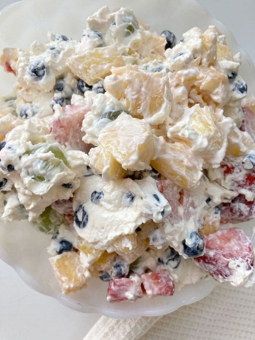 Een heerlijke en revitaliserende traktatie, Cheesecake Fruit Salad combineert de fluweelzachte zachtheid van cheesecake met de knapperige, sappige goedheid van fruit uit het seizoen. Een basisrecept om het te maken is dit: