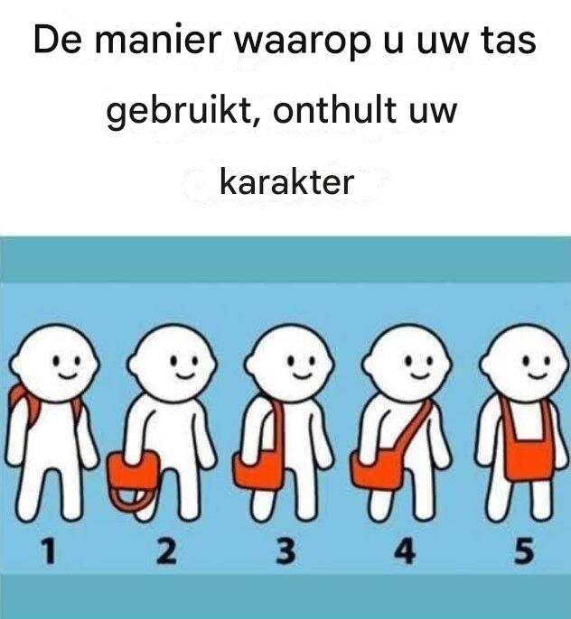 Als je je tas liever in je hand draagt, verraadt dit een dominante aanwezigheid en een sterk gevoel van controle. Je hecht waarschijnlijk waarde aan orde en vindt het prettig om de controle over je omgeving te hebben. Deze manier van het dragen van een tas is gebruikelijk bij mensen die oog hebben voor detail en gedijen in omgevingen waar ze hun organisatietalent kunnen oefenen.Je neiging om je tas in je hand te houden symboliseert een verlangen naar meesterschap en onafhankelijkheid. Je bent het type dat graag op de hoogte blijft en waarschijnlijk over bijna alles een weloverwogen mening heeft. Deze nieuwsgierigheid stimuleert je intellectuele groei en zorgt ervoor dat je altijd op de hoogte bent van de laatste trends en gebeurtenissen. Hoewel je misschien assertief overkomt, maakt je directe en betrouwbare houding je betrouwbaar en betrouwbaar.