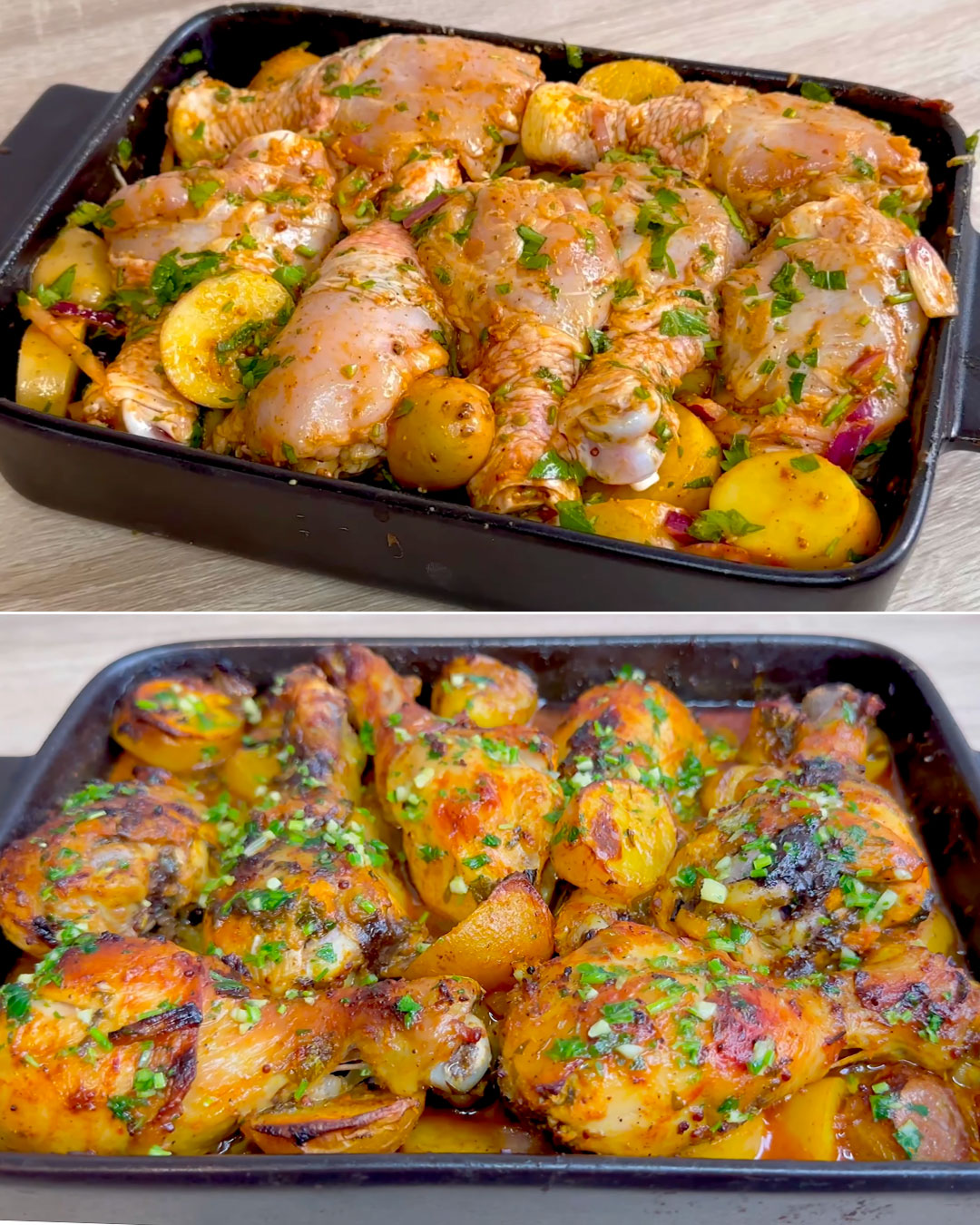 Doe de pan in de voorverwarmde oven en bak gedurende ongeveer 45-50 minuten, of totdat de kip goudbruin is en de aardappelen gaar zijn. Draai de kip halverwege om, zodat de kip gelijkmatig gaart.