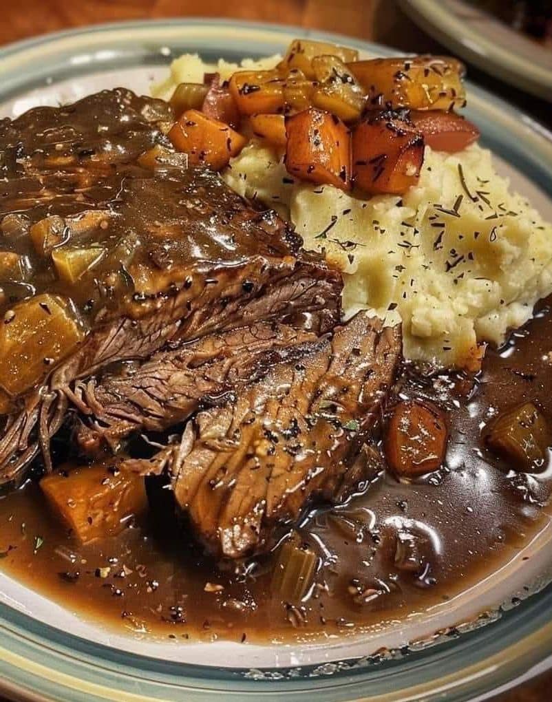 Gestoofd rundvlees is een rijk, geruststellend gerecht gemaakt door mals rundvlees langzaam te koken in een hartige bouillon naast groenten en aromatische kruiden. Het is perfect voor een gezellig diner, geserveerd met romige aardappelpuree om de smaakvolle saus op te nemen.