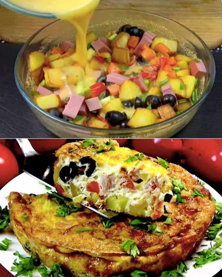 Doe nu de ingrediënten in de pan en giet er als laatste de geklopte eieren overheen.