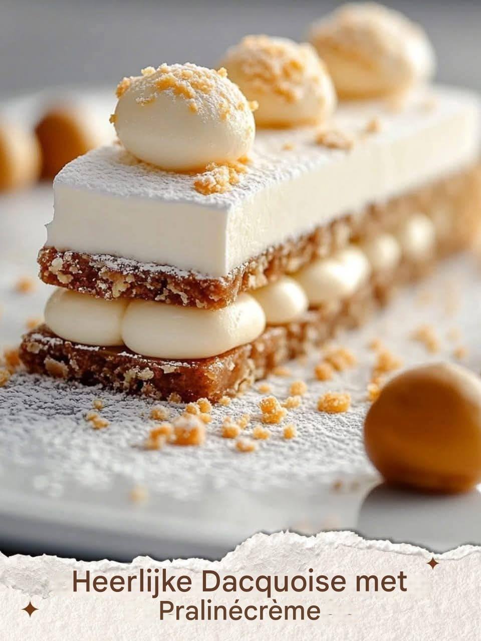 Heerlijke Dacquoise met Pralinécrème is een echt decadent Frans dessert, bekend om zijn laagjes meringue en amandelbiscuit, gevuld met een rijke, romige pralinécrème. Hier is een leuk recept waarmee u deze heerlijke lekkernij thuis zelf kunt maken!