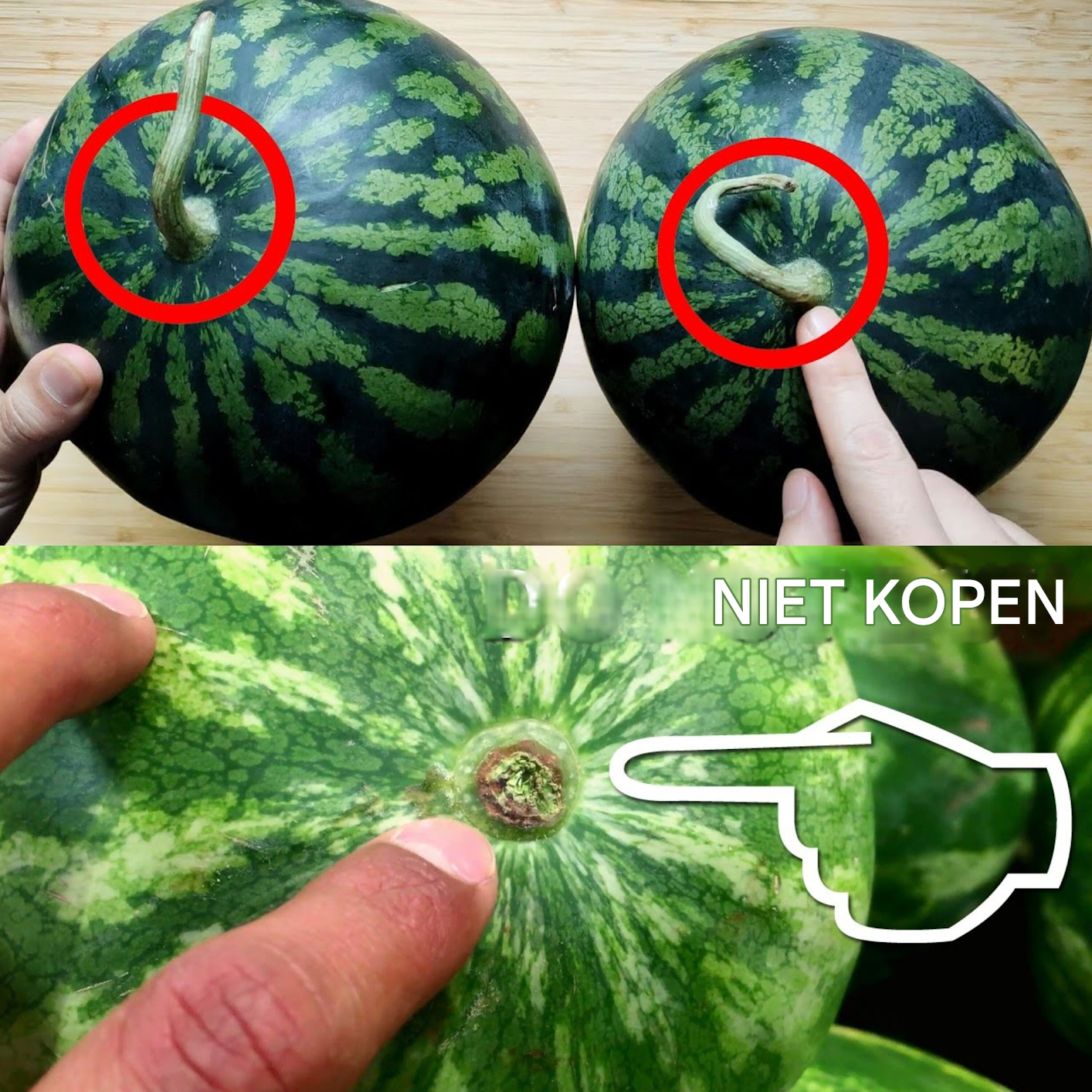 Vervolg op de volgende paginaDe staart van de watermeloen kan de rijpheid ervan aangeven. Een gedroogde staart suggereert dat de watermeloen rijp is, terwijl een groene staart kan betekenen dat hij te vroeg is geplukt en misschien niet zo zoet is.