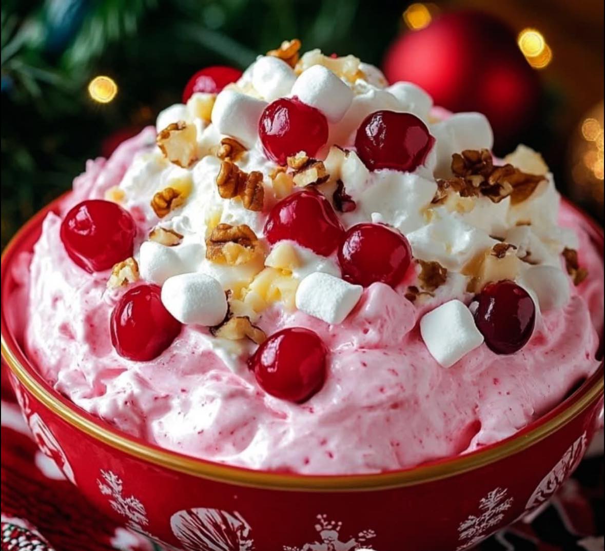 Christmas Cherry Fluff is een feestelijke, niet-gebakken dessertsalade die perfect is voor vakantiebijeenkomsten of potlucks. Het is romig, zoet en vol fruitige goedheid met een mix van kersentaartvulling, geplette ananas en gezoete gecondenseerde melk. Gegarneerd met slagroom, marshmallows en noten, is deze publieksvriendelijke traktatie snel en gemakkelijk te bereiden, waardoor het een favoriet voor de feestdagen is.