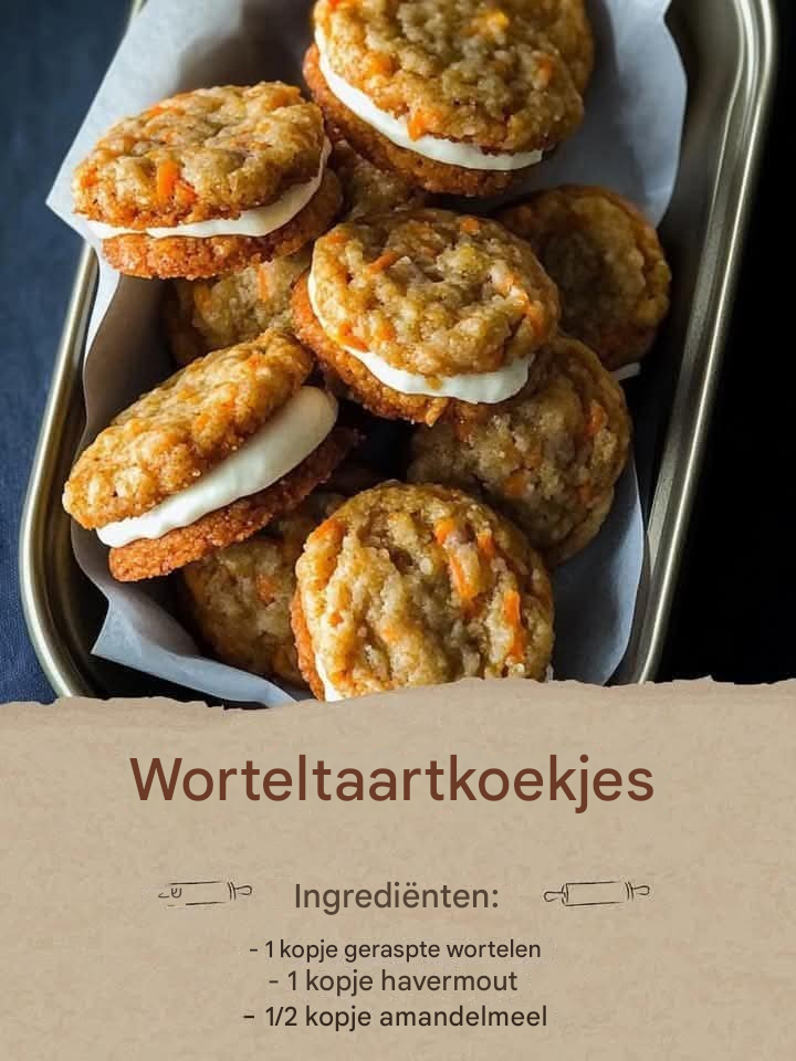 aken van worteltaart en het gemak van een traktatie uit de hand. Deze koekjes zijn zacht, taai en gevuld met gezonde ingrediënten zoals geraspte wortelen, havermout en amandelmeel. Met een romige vulling ertussen zijn ze een gezondere verwennerij die luxueus aanvoelt. Of je ze nu bereidt voor een feestelijke gelegenheid of gewoon om van te genieten met een kopje thee, deze koekjes zullen snel een favoriet worden in je huishouden.