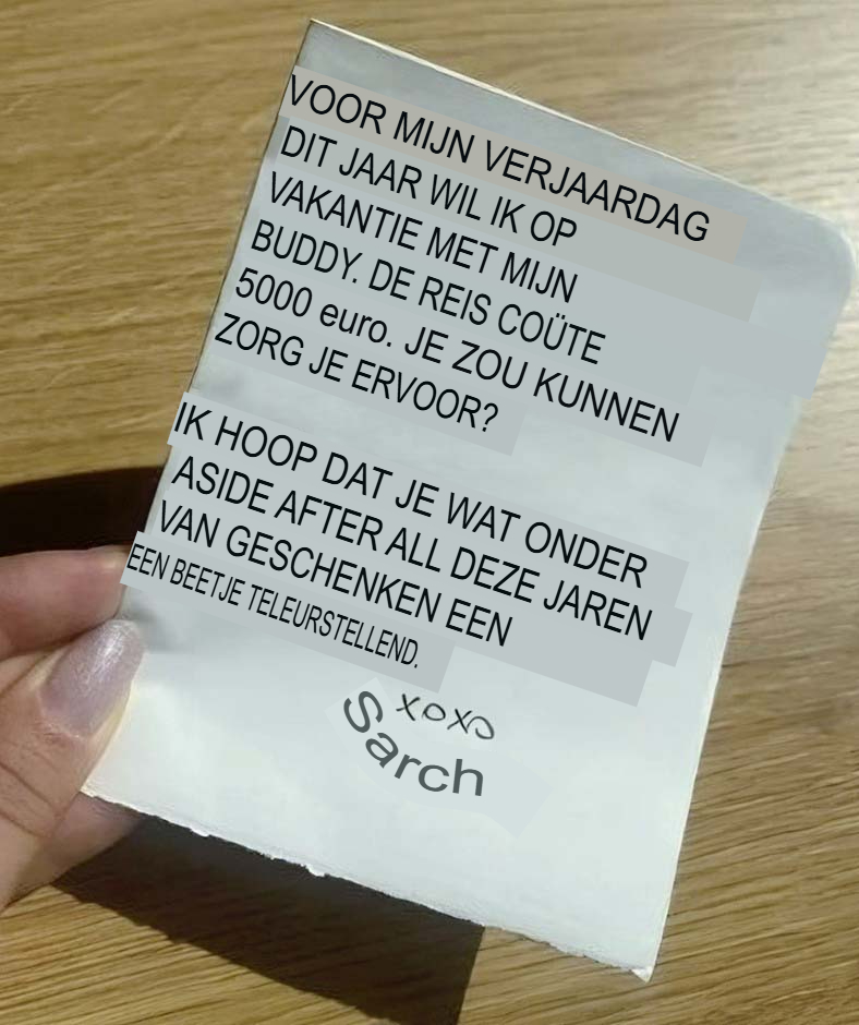 In de brief, vergezeld van een offerte voor 5.000 euro , werd hen gevraagd een vakantie voor haar bruiloft te financieren, met de bijtende opmerking: “Ik hoop dat je na al die jaren van goedkope cadeaus genoeg hebt gespaard.”