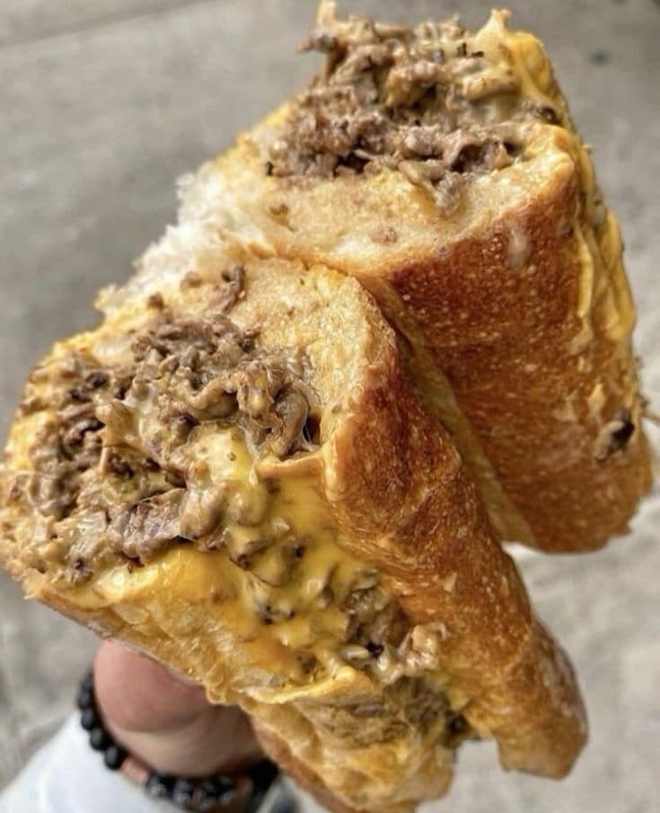 Leg het pinnacle broodje met de kaas op de top van het achterste broodje met het philly cheesesteak vlees. Eet warm!