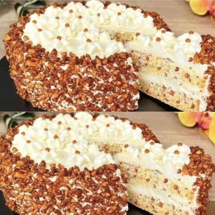 10. Stel het dessert samen: bevochtig de cakelagen met een beetje melk en bestrijk ze met de topping. Gebruik de vulling ook om de hele taart te bedekken.