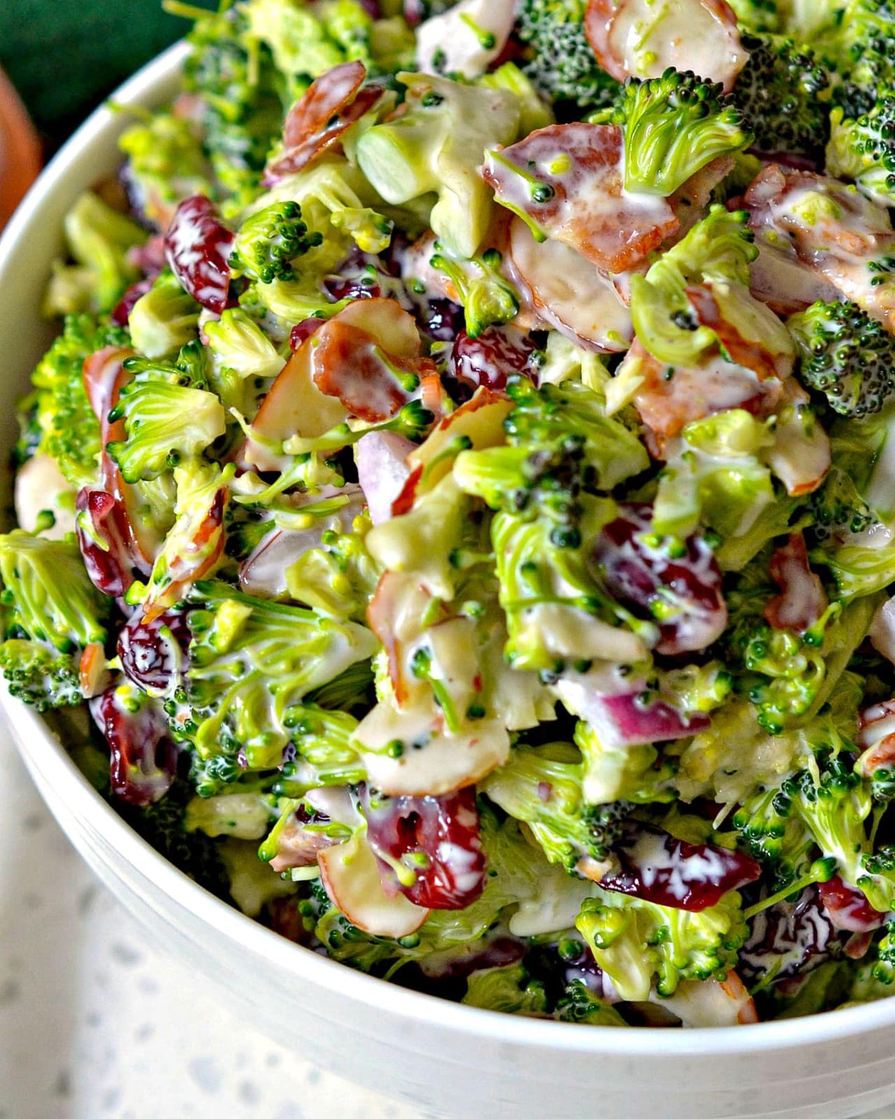 Deze romige broccolisalade is een perfecte mix van knapperige, zoete en hartige smaken. Boordevol verse broccoliroosjes, gedroogde veenbessen, geroosterde amandelen en een pittige dressing, is het een geweldig bijgerecht voor bijeenkomsten of zelfs als lichte lunch.