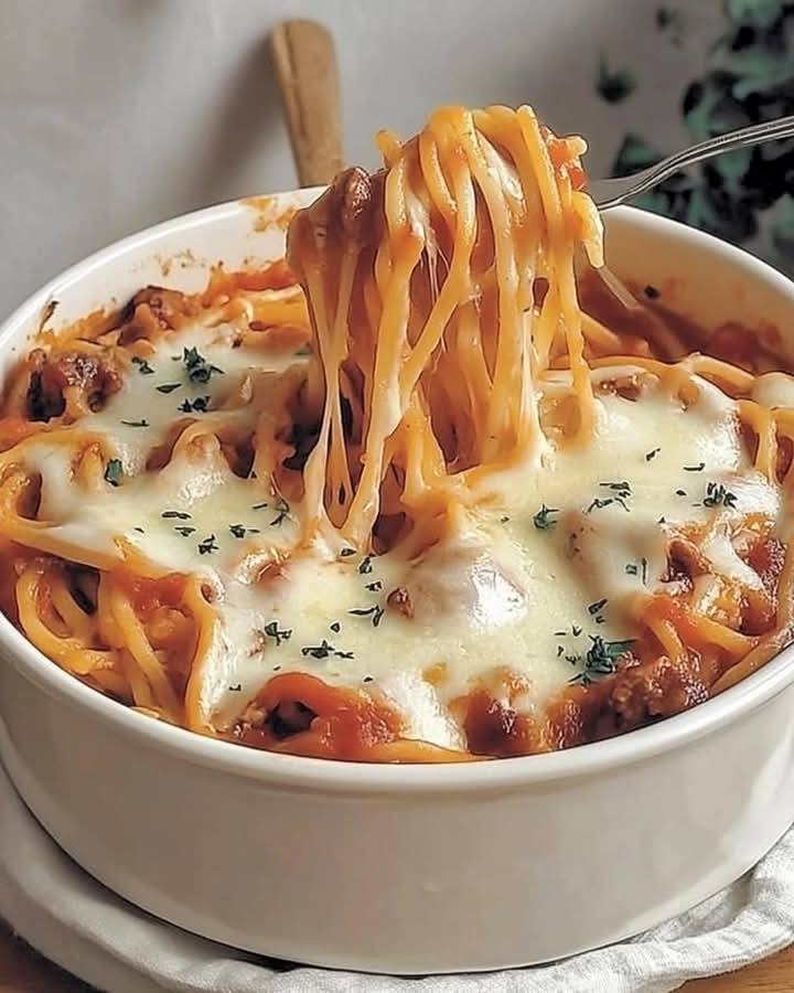 Verwarm de oven voor op 180°C. Giet een laag tomatensaus in een ovenschaal en verdeel het mengsel over de bodem van de schaal. Leg vervolgens een laag gekookte spaghetti erop. Herhaal het proces en wissel de lagen saus en pasta af. Bestrooi elke laag met geraspte kaas en Parmezaanse kaas. Bestrijk het gerecht met een royale laag geraspte kaas.