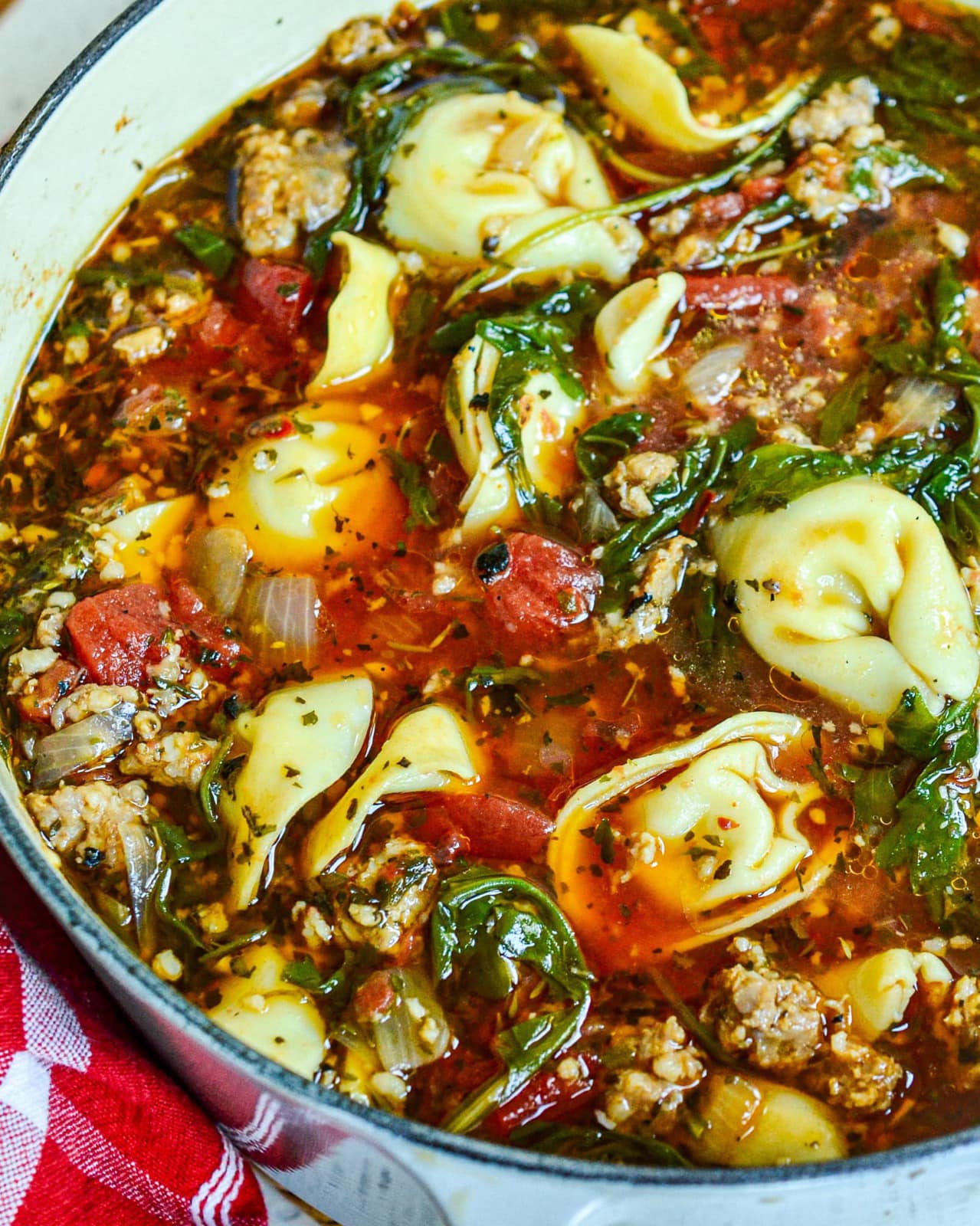 Bruine Italiaanse worst in een pan of soeppan op middelhoog vuur. Als de worst bijna helemaal bruin is, voeg je de ui toe en kook je tot de worst bruin is en de ui zacht is. Zet het vuur lager en voeg knoflook, basilicum, oregano, peterselie, tijm en rode pepervlokken toe; Kook gedurende 1 minuut, onder voortdurend roeren. Klop in een kleine kom de tomatenpuree los met ongeveer 1/2 kopje runderbouillon. Voeg de groentebouillon, de resterende runderbouillon, geroosterde tomaten en verdunde tomatenpuree toe. Verhoog het vuur tot medium en laat sudderen. Zet het vuur lager en laat sudderen. Voeg kaastortellini toe