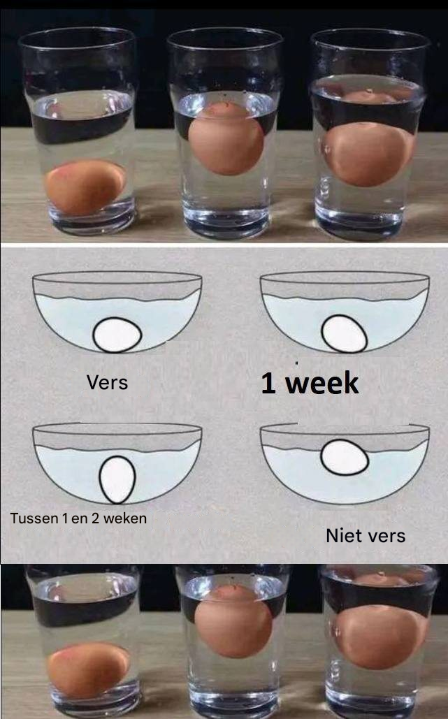 Om dit te doen, moet je het ei in een slakom of een pan doen die gevuld is met water. Als het op de bodem van de container valt, is het nog steeds veilig om te consumeren, zelfs als het deze staat heeft bereikt.