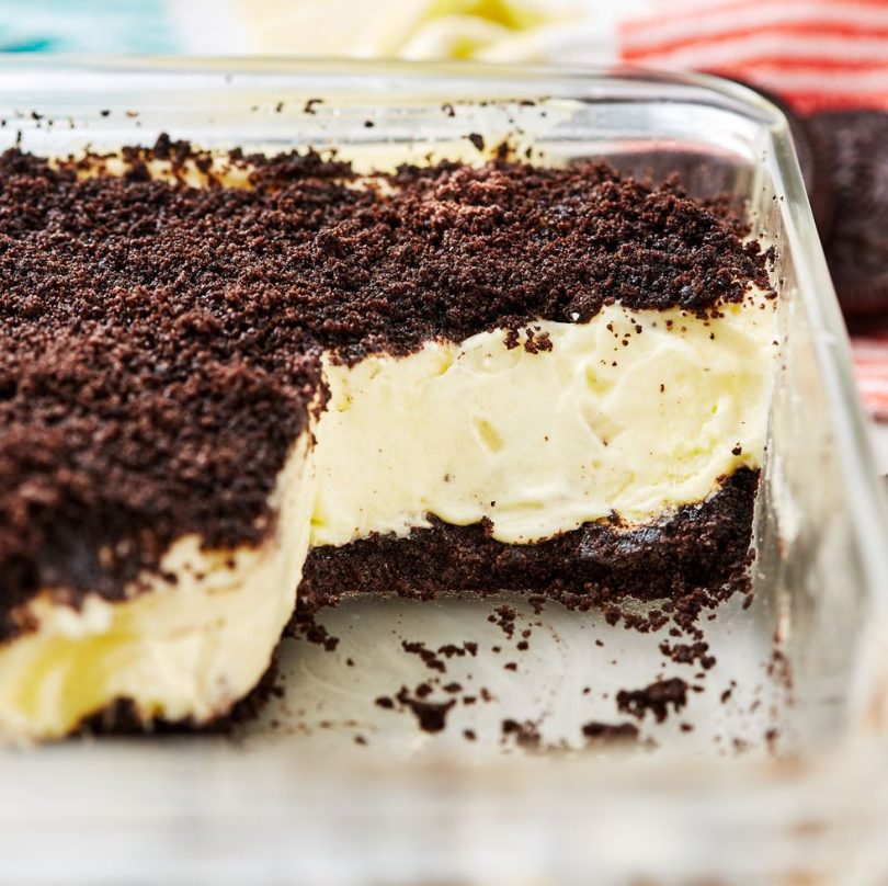 Dirt cake klinkt misschien niet smakelijk, maar het is eigenlijk het makkelijkste en lekkerste dessert. Een Oreo-bodem wordt bedekt met een roomkaaspuddingmengsel en vervolgens bestrooid met meer Oreo’s voor de goede orde. Het is een makkelijk dessert zonder bakken dat we het hele jaar in onze koelkast zouden willen bewaren. Deze cakeversie lijkt erg op Dirt Pudding, dat in individuele cups wordt gemaakt, en chocoladepudding! Ga een stapje verder met het thema en voeg er gummy wormen aan toe of leen van onze carrot patch brownies en maak met chocolade bedekte aardbeien die op wortels lijken!
