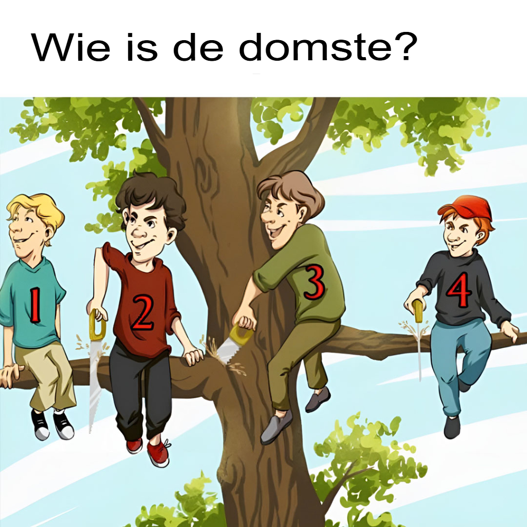 Heb je het gevonden? De jongen met de rode hoed is degene die de meest dramatische fout maakt. Hij zaagt rechtstreeks in de tak waar hij op zit, waardoor zijn stabiliteit in gevaar komt!Moraliteit?