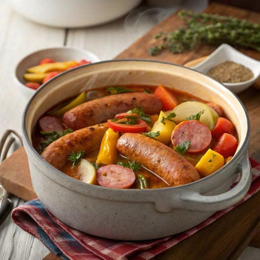Er zit iets magisch in lang gestoofde gerechten, zoals deze worst- en groentestoofpot. Dit gerecht brengt me terug naar de zondagen uit mijn kindertijd, toen de geur van worst en groenten het huis vulde en ons allemaal samen aan tafel bracht. Elke hap is een zoete herinnering.