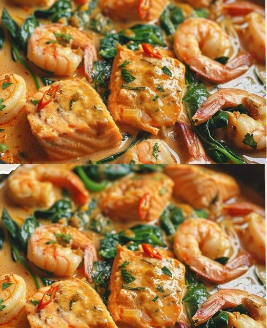 Zalm en Garnalen in Kokosmelk Saus met Spinazie