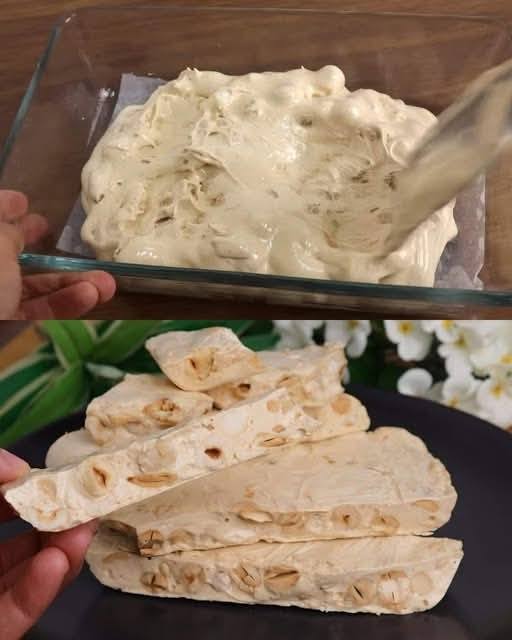 Laat de noga uitharden: dek af en laat de noga 2 uur op kamertemperatuur uitharden. Serveer en geniet: als de nougat klaar is, haal hem dan uit de vorm en snijd hem in kleine stukjes.