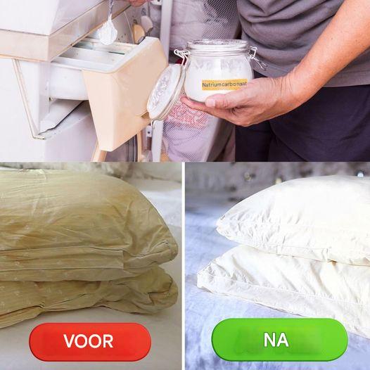 Voorbehandeling: Om ernstige vlekken aan te pakken of om de witheid te herstellen, weekt u uw kussens in een oplossing van citroensap, witte azijn of waterstofperoxide voordat u ze wast. Deze voorbehandeling kan helpen vlekken af te breken en de stof op te helderen.
